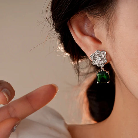 14K Gold-Plated Zircon Flower Green Diamond Earrings