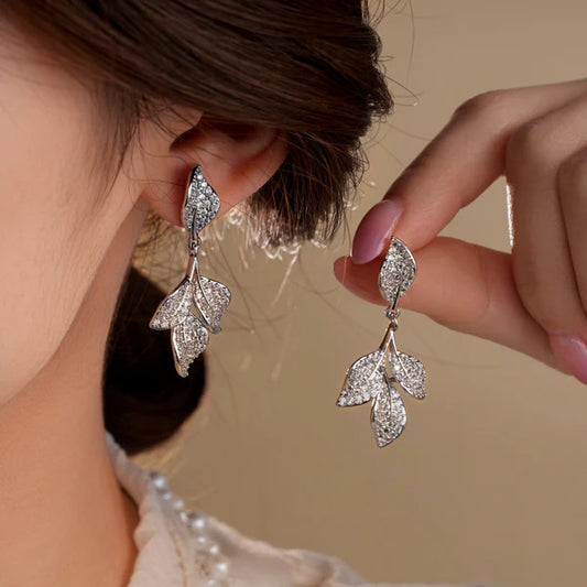 14K Gold-Plated Zircon Leaf Tassel Earrings